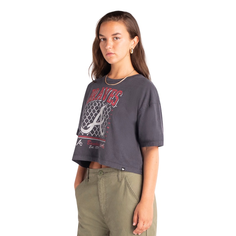 The Atlanta Braves Old School Sport Women’s T-Shirt features a distressed screen-printed Braves graphic at the front.