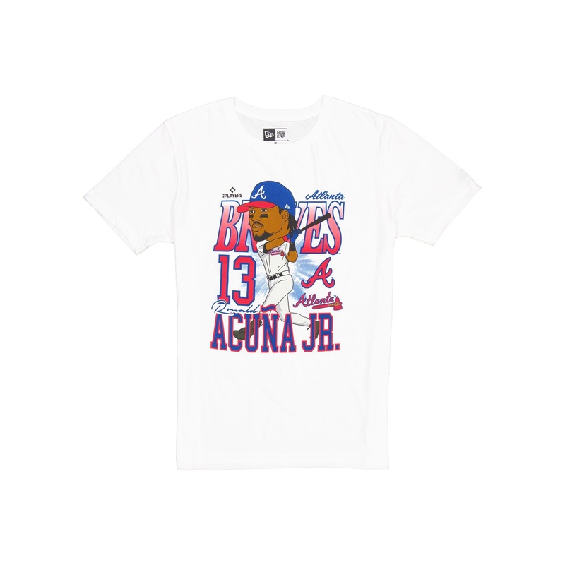 The Atlanta Braves Ronald Acua Jr. Caricature T-Shirt features the player’s name and number with the Braves logo and wordmark screen-printed at the front.