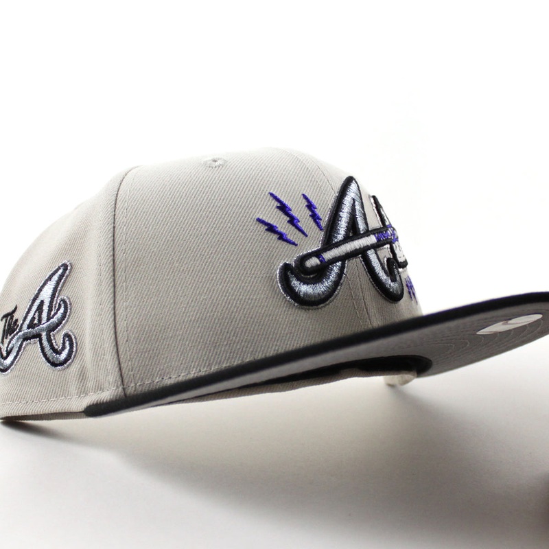 Atlanta Braves The A Patch New Era 59Fifty Fitted Hat in Stone Gray, Black and Gray Under Brim.Inspired by Nike SB Dunk Low Light Cream Thunderstorm with our own twisted to it.
