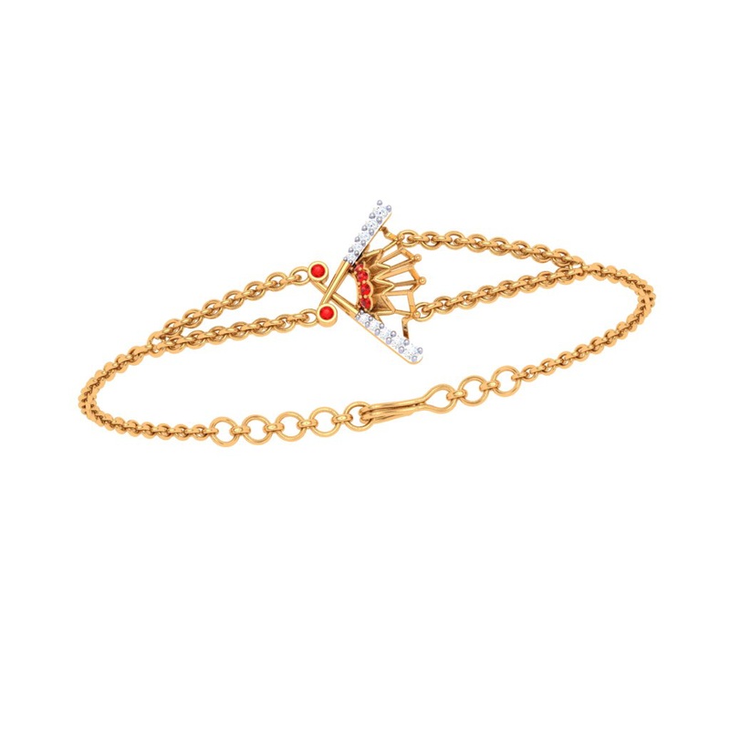 The festive season indeed calls for the adorn of its kind. Add a dash of shine to yourself with this impeccably crafted red stone studded diamond and gold pendant design from our collection. The pendant comes with a dimension of 5.1 CM X 5.85 CM X 5.1 CM, weighs 2.65 gm and bears BIS Hallmark Certification. The diamond bears a weight of 0.07 gm.