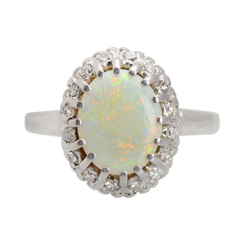 The vintage setting is 14k white gold with an open under gallery that allows light to pierce the opal and diamonds for added life and brilliance.