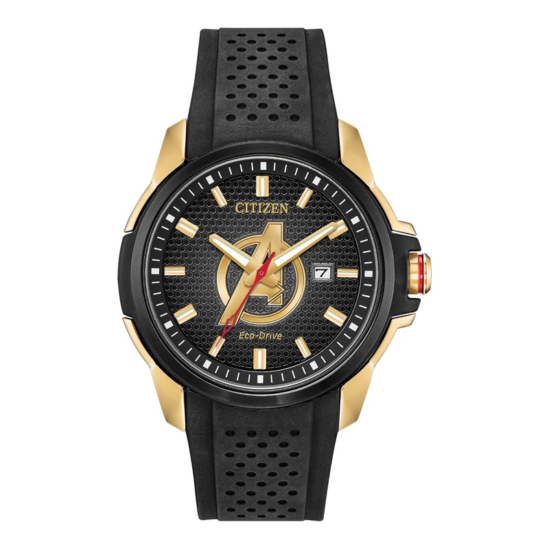 Wear your Super Hero on your wrist with the new Marvel Avengers timepiece by Citizen. The iconic Avengers logo showcased on a black patterned dial within a black ion-plated stainless steel case with a gold-tone chroma finish and black silicone strap with date. Featuring our Eco-Drive technology powered by light, any light. Never needs a battery. 2019 MARVEL