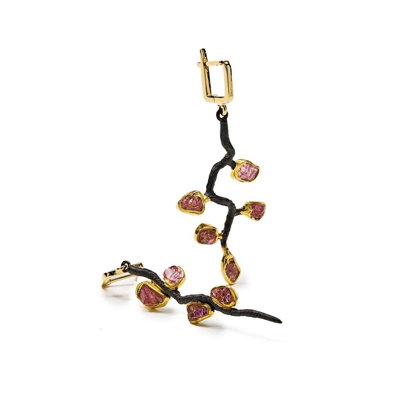 Piercing shards of black anthracite snake their way downwards in a thrusting spear of passion. Glittering rough garnets cling to its length as they are tossed in an epic battle of shape and form. Glints of delicate gold offer highlights of brilliant sheen in these Earrings.