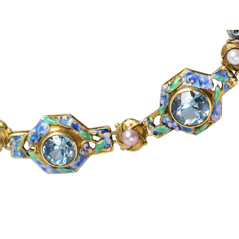 Connecting the plaques are six flower buds of yellow gold, each set with a natural saltwater seed pearl nesting within the petal folds. Completing the bracelet is a box clasp of enamel and gold set with seven old European cut diamonds, total weight of .35 carats (color J-K, clarity SI1-2).