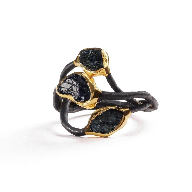A black anthracite band loops up in a natural and undulating shape to culminate in rough sapphire gemstones. They have a blue shimmer and depth that speaks of the forces of nature. Each jewel is trimmed with a delicate band of gold.PLEASE NOTE that we only