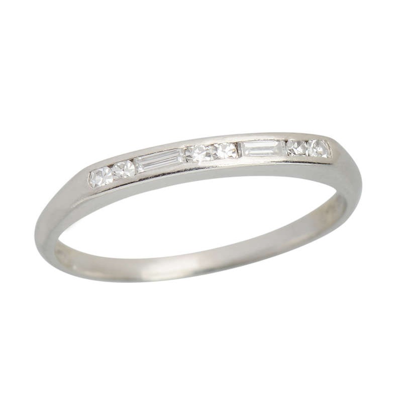 Set in a unique alternating pattern, the six single-cut and two baguette diamonds total .16 carats that are white and lovely at G-H color, with VS clarity.