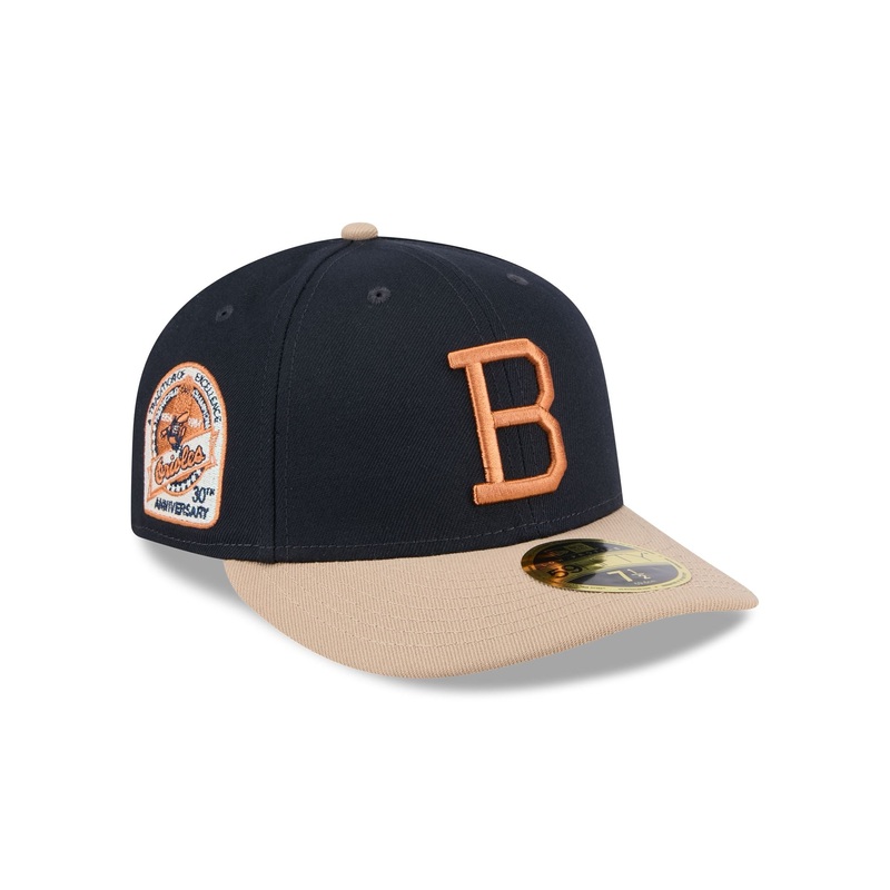 The Baltimore Orioles Blue Ivory Low Profile 59FIFTY Fitted Cap features an embroidered Orioles Cooperstown logo at the front panels with a matching MLB Batterman logo at the rear. Additional details include a 30th Anniversary patch at the right-wear side