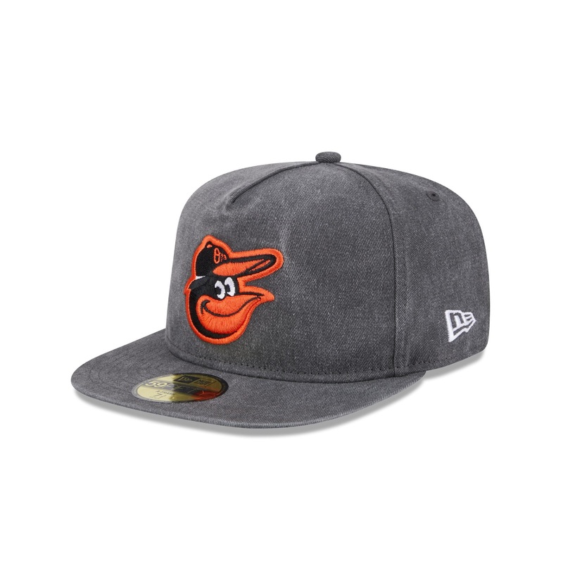 The Baltimore Orioles Pigment Dye 59FIFTY A-Frame Fitted Cap features an embroidered Orioles logo at the front panels with a matching MLB Batterman logo at the rear. Additional details include a washed fabrication throughout and a gray undervisor.