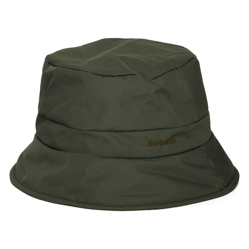 The Barbour Calgary Bucket Hat in army green is a padded, showerproof bucket hat with a fleece lining for added warmth, making it the perfect accessory for cold and rainy winter days. The Barbour name is embroidered on the front left, and a adjustable cord