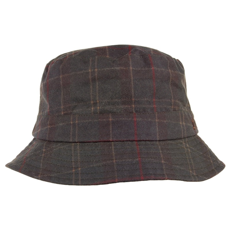 This is the Darwen Wax Cotton Bucket Hat in navy-olive from Barbour. This great bucket hat has a tartan pattern and a small leather Barbour logo on the side. This hat is made of waxed cotton which makes it great for rainy days. The inside has a cotton lining and cotton sweatband for extra comfort.