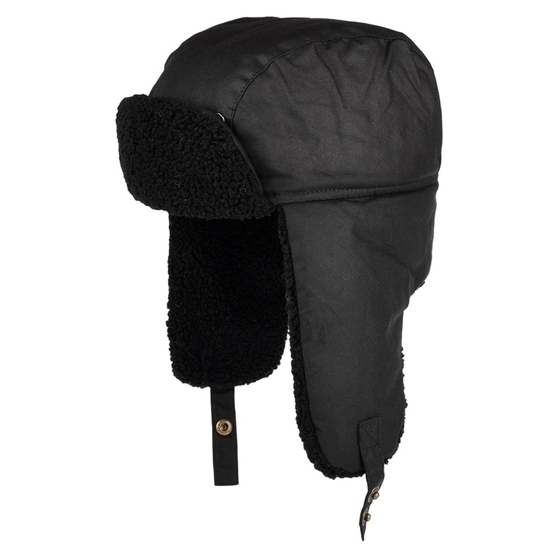 The Barbour Hats Morar Waxed Cotton Trapper Hat in black is a super warm trapper featuring sherpa lined earflaps and a tartan lining for the cold winter months. The outer shell is made of waxed cotton, so if you get caught in a rain shower, it will keep yo
