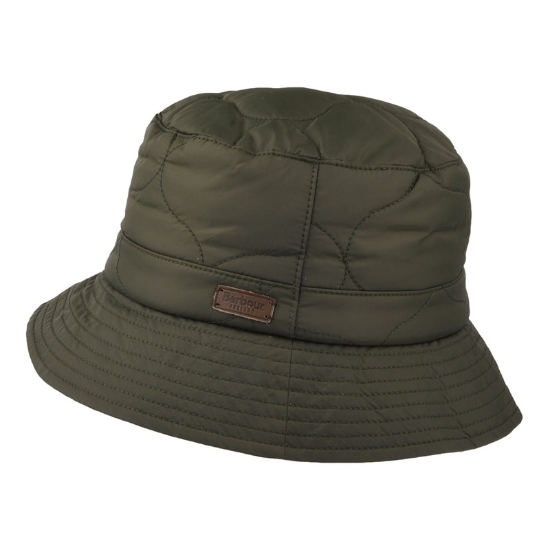 The Barbour Hats Onion Quilt Bucket Hat in olive is a classic quilted bucket hat with a soft fleece lining and a tartan sweatband. The hat features a leather Barbour tag sewn on the side. A perfect style for the colder days!