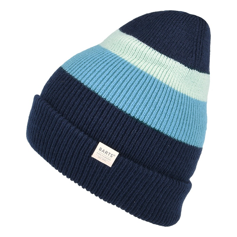 This is the Cowie Striped Cuff Knit Beanie Hat from Barts in blue. This great beanie has a cuff and is double layered for extra warmth. On the side is a Barts tab sewn onto the cuff. A cozy striped beanie for the winter. Hat Details:Made of 100% acrylicDou