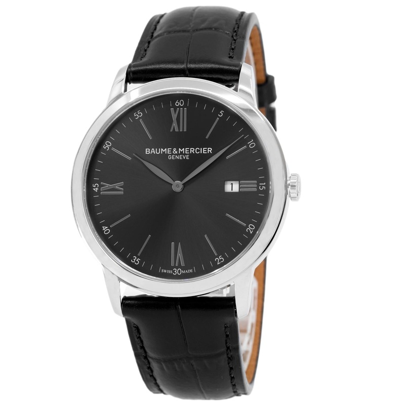 TECHNICAL DATABrand: Baume & MercierFamily: ClassimaReference: M0A10416Name: Baume&Mercier Men’s 10416 Classima QuartzCASEMaterial: SteelGlass: Sapphire GlassDiameter: 42 X 0Case Thickness: 8.95Water Resistance: 5 ATMDIALColor: GreyDial Markers: Roman numeralsBezel: Stainless SteelMOVEMENTType: QuartzCalieber: QuarzBase Caliber: –BANDMaterial: LeatherColor: BlackClasp: TangFUNCTIONSDate,