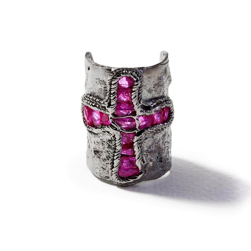 An uncommon ring, even within the realm of ‘s freakaverse. This piece celebrates imperfections and the magic of nature that elevates our human capabilities. Wild ruby crystals, untouched by human hands, just as they emerged from the Earth, form a cross on the organically textured blackened silver surface. This ring is a singular creation, unreplicable and as exclusive as they come.