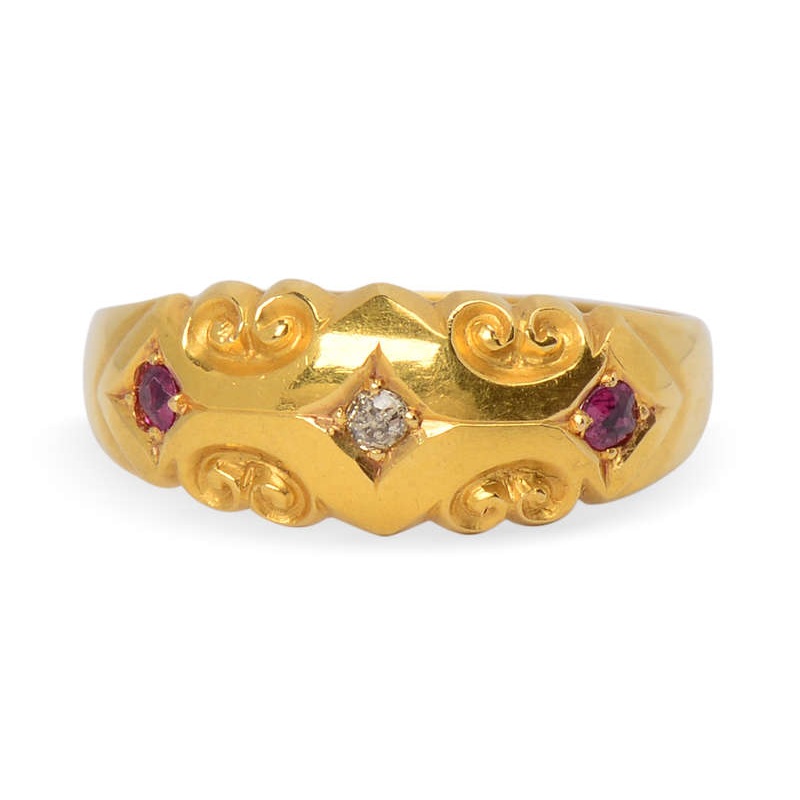 Two natural rubies and an old-cut diamond, while diminutive, add a touch of color and shimmer to the 18k gold ring that dates to 1901.