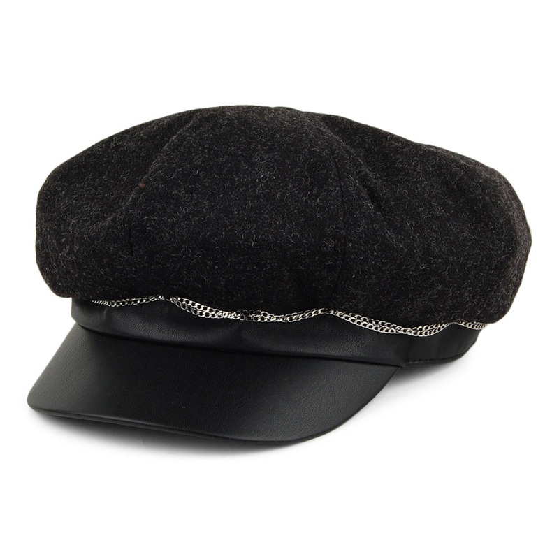 The Clara Baker Boy Hat in black is beautiful new cap from Betmar Hats. The cap has a features a wool mix crown and a faux leather trim, visor and button on the top. There is a decorative metal chain all around the cap and a metal Betmar pin attached at the back.