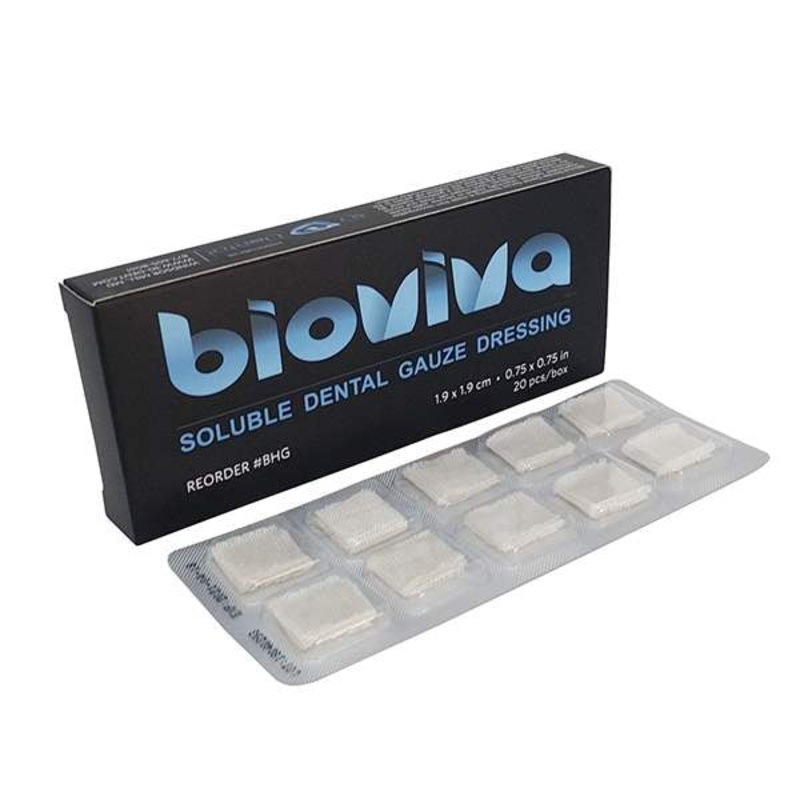Bioviva absorbs blood and immediately transforms into a viscous gel, sealing the extraction site, filling wound voids, seals capillary ends and activating the clotting system to assist the body to stop bleeding.