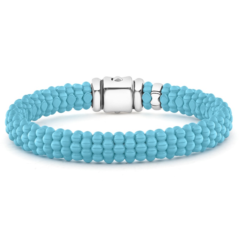 Smooth stations of blue ceramic with sterling silver Caviar stations form this versatile bracelet. Finished with a signature lobster clasp detailing the LAGOS crest.Sterling SilverSignature Lobster ClaspWidth 5mmSTYLE #: 05-81385-CT7