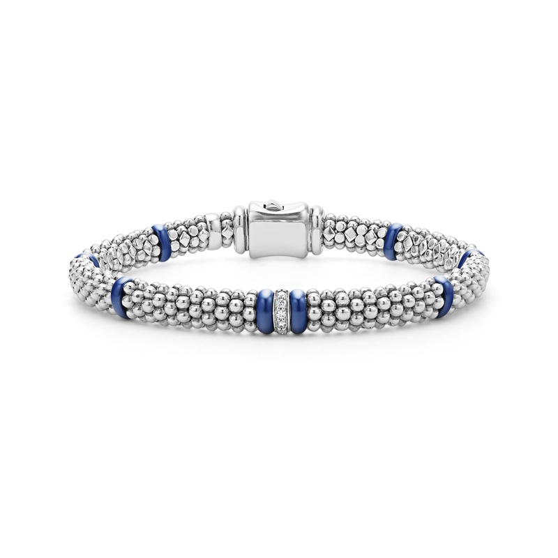 A single diamond station set in sterling silver surrounded by ultramarine ceramic and Caviar beading. LAGOS diamonds are the highest quality natural stones.Sterling Silver & Ceramic0.05 CaratOne Presser ClaspRope Width 6mmDiamonds are G-H color and SI clar