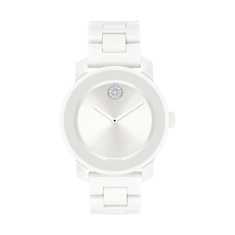 Movado BOLD Ceramic, 36mm stainless steel case and bracelet with blush ceramic centerlinks and a silver-toned dial with a crystal pave dot and a crystal set bezel.