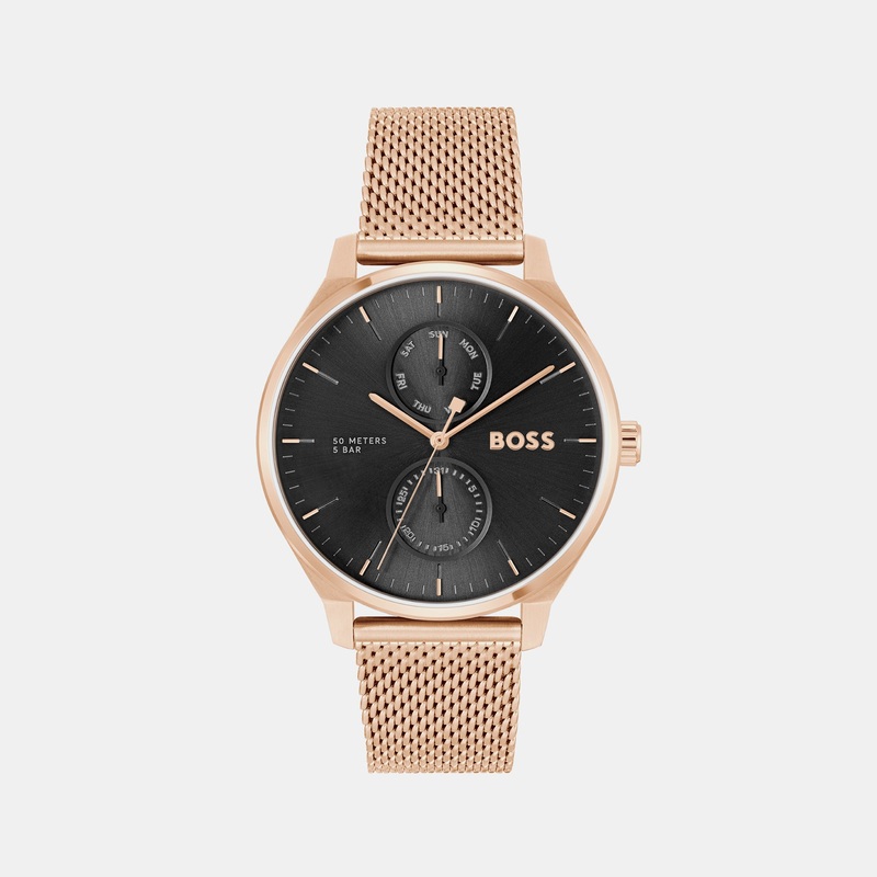 Elevate your wrist game with our 43mm round chronograph quartz watch for men. The black stainless steel dial, mesh strap (20mm width) in rose gold, and sliding clasp make a bold statement. Water-resistant up to 5 ATM, this chronograph weighs 90 gm with a s