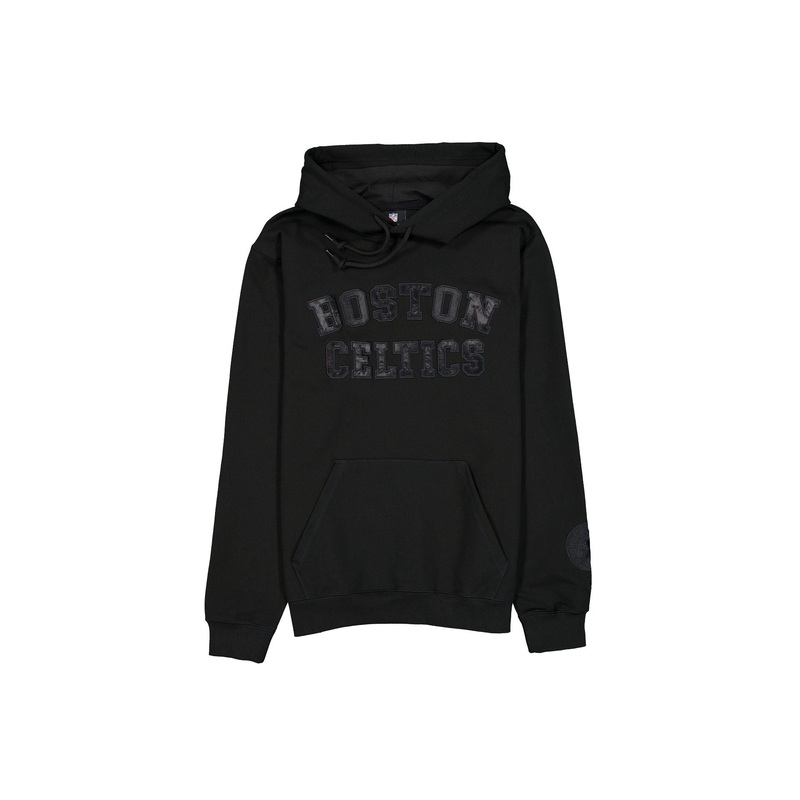 The Boston Celtics Black on Black Logo Select Hoodie features a satin applique with a tonal stitch Celtics wordmark at the chest and an embroidered team logo at the left-wear sleeve.