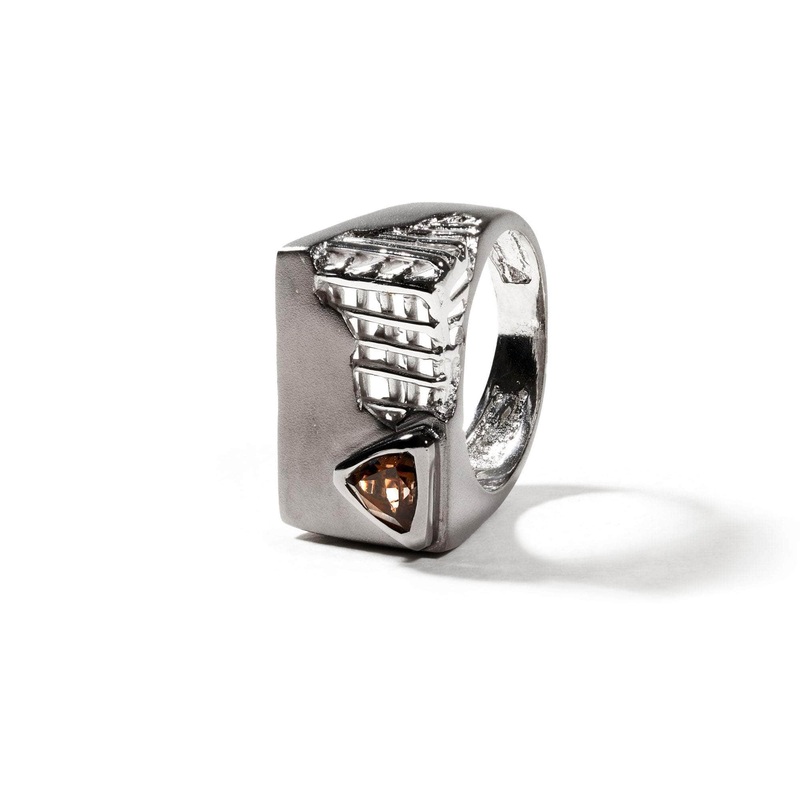 An equilateral trillion-cut smoky quartz placed in an imperfect rectangular silver structure – meet the newest addition to the Geometry collection.