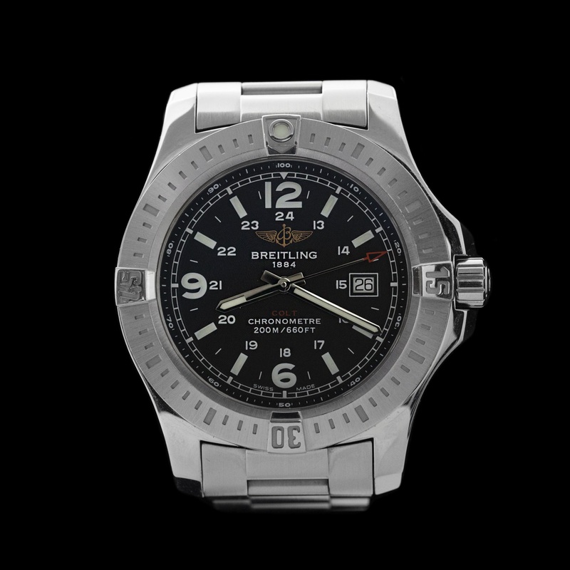 WHAT WE LOVE: These Breitlings are built super tough. Technically designed with pilots in mind, this watch is also depth rated to 200M. Brand: Breitling Reference: A7438811/BD45 Model: Breitling 2016 Colt Quartz Movement: Breitling Caliber 74 Quartz Case M