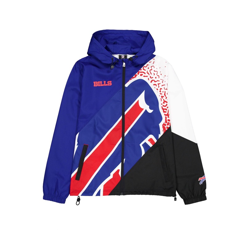 The Buffalo Bills Sport Classics Color Block Windbreaker features a screen-printed Bills logo at the right chest and an alternate team logo at the left wrist. Additional details include a sublimation printed team graphic across the front and a full zip clo