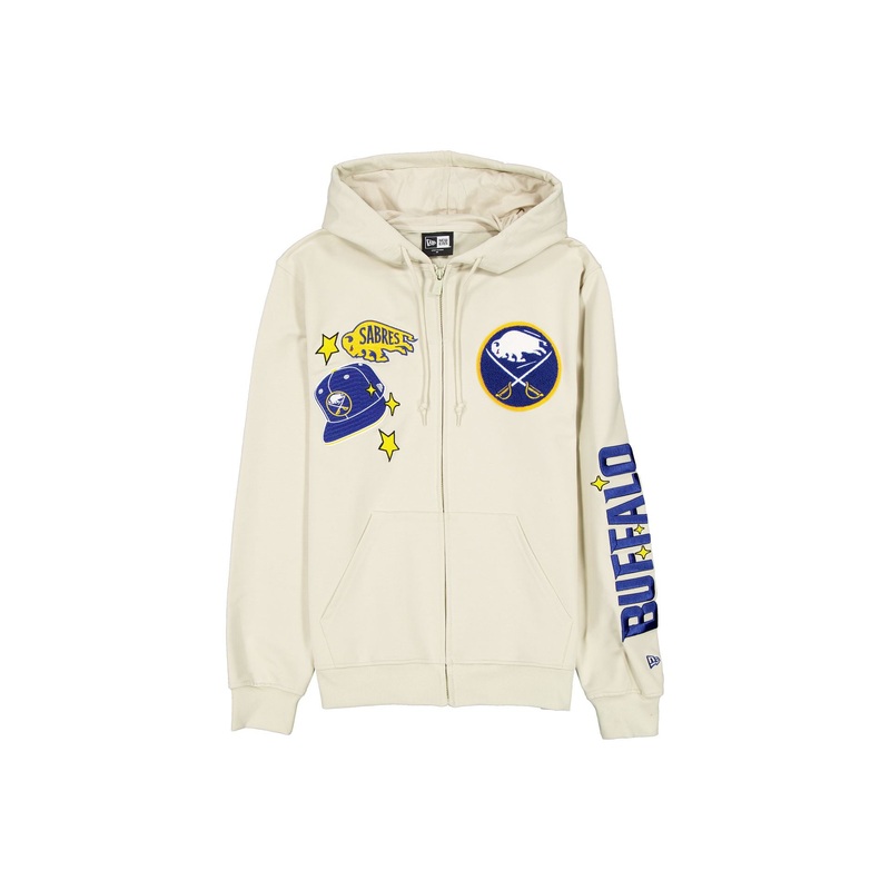 The Buffalo Sabres Stone Logo Select Hoodie features an embroidered chenille applique Sabres logo at the left chest with an embroidered team cap and patch at the right. Additional details include a zipper closure, pockets, adjustable drawstrings at the hood, and an embroidered team wordmark at the left arm.