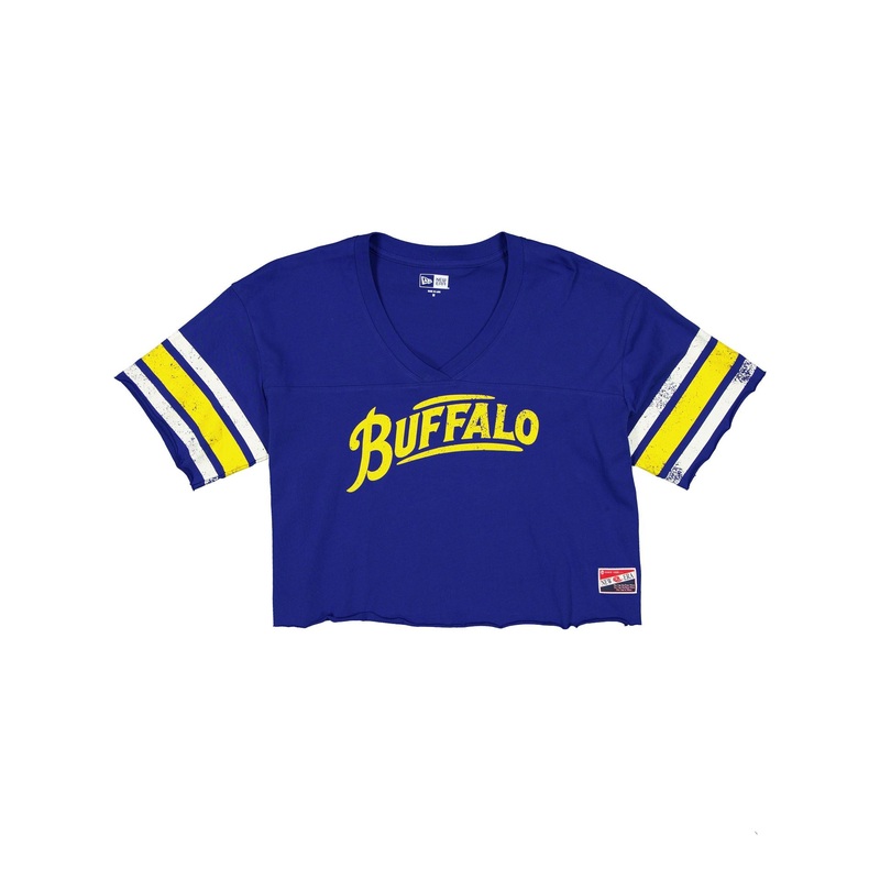 The Buffalo Sabres Throwback Cropped Women’s T-Shirt features a screen-printed Sabres graphic at the front with a New Era jock tag at the left hip. This shirt has a cropped fit.