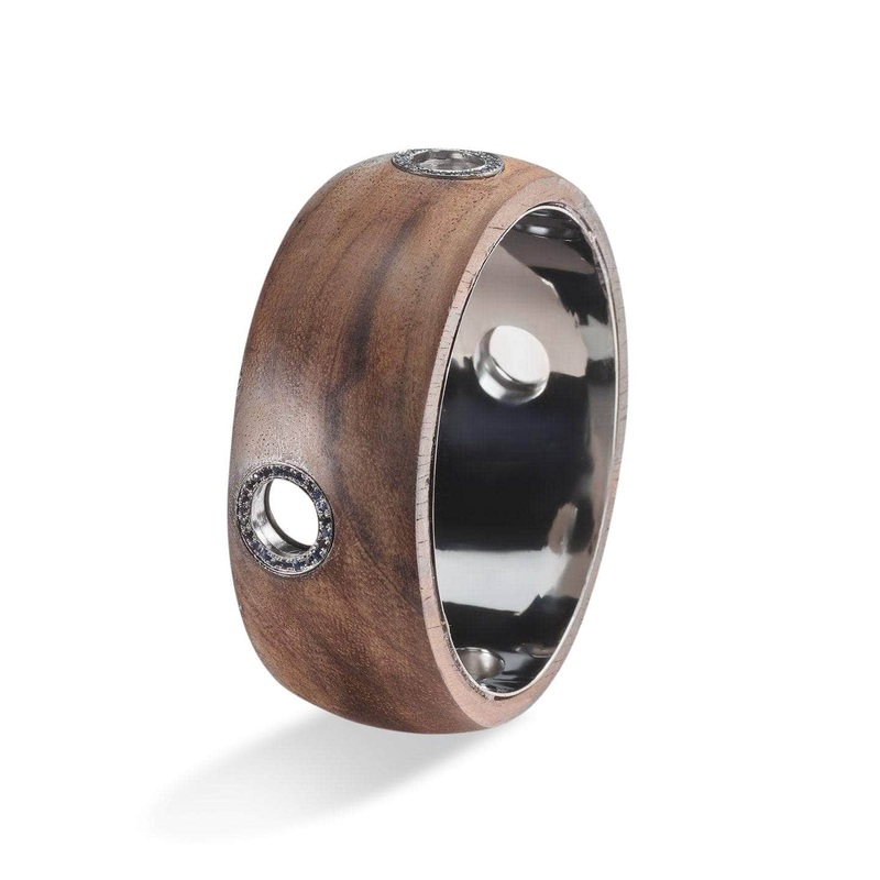 An arresting bangle crafted of natural black rhodium which is precious to behold. A central glimmering sapphire lights up the dark as a beacon to the hopeful and provides an injection of color that is sumptuous and decadent in its natural untamed form.