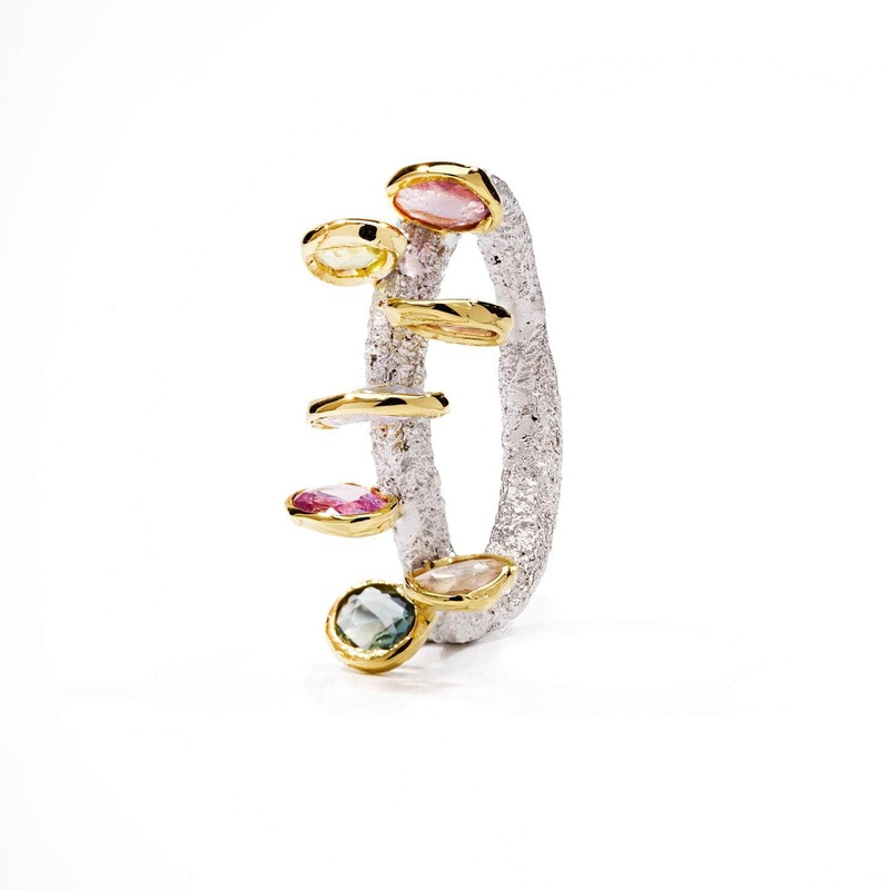 Elegant and graceful the cycle of life is mirrored in this crystal clear white rhodium and gold ring. Mixed sapphire gemstones litter the crown with their own soulful light and life.Silver 925Stones: SapphirePlating: White Rhodium, 18K GoldWidth 7 mmBand w