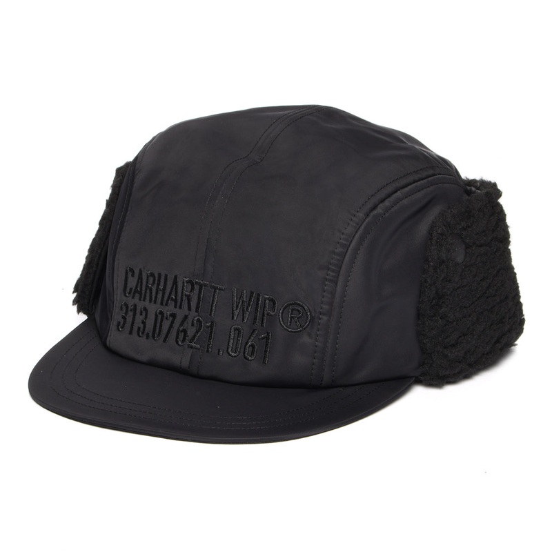 The Olten 4 Panel Cap With Earflaps in black from Carhartt is an unstructured, lined style made of nylon twill. It is a four panel design with a firm, curved brim, and faux sherpa lined earflaps. The cap is finished with a Carhartt WIP embroidery on the front.