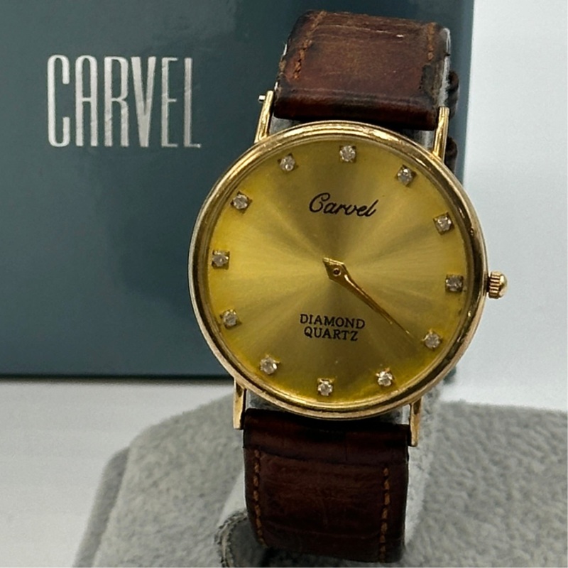Focused on understated luxury, Carvel watches from the 1970s often featured solid gold cases and diamond detailing, embodying the era’s preference for timeless sophistication over fleeting trends. This diamond-accented 9ct gold model is a classic representation of Carvels dedication to refined luxury and enduring style.