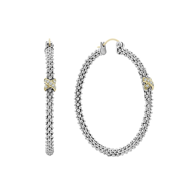 Signature sterling silver Caviar beads accented by an 18K gold x station on these hoop earrings. Finished with 14K gold posts.Sterling Silver0.07 CaratLocking WireDimensions 35mm x 4mmSTYLE #: 01-81025-00
