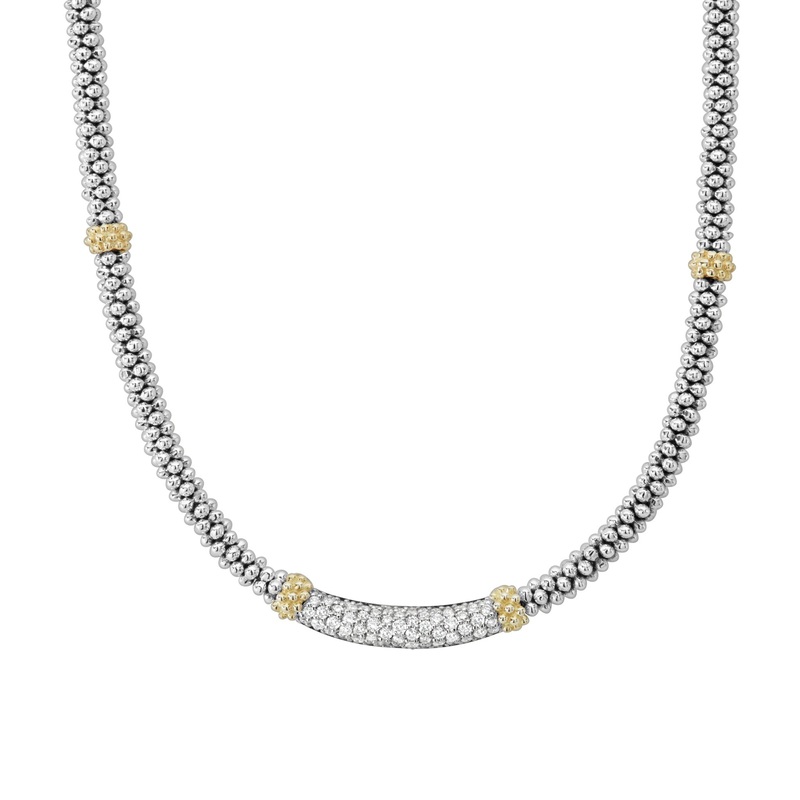 A diamond station accented by 18K gold forms this sterling silver Caviar beaded necklace. LAGOS diamonds are the highest quality natural stones.