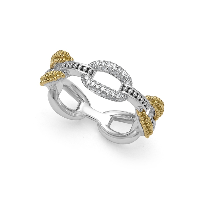 18k gold and sterling silver variations of Caviar beading & fluting elements accented by diamonds form this oval link ring. LAGOS diamonds are the highest quality natural stones.Sterling Silver & 18K Gold0.12 CaratBand Width 6mmDiamonds are G-H color and S
