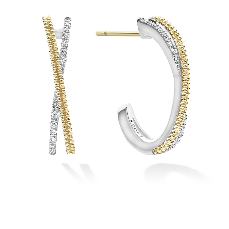 Diamonds, 18K gold Caviar beading and sterling silver form these classic X-motif hoop earrings. LAGOS diamonds are the highest quality natural stones.Sterling Silver & 18K Gold0.16 Carat14K Gold PostDimensions 13mm x 5mmDiamonds are G-H color and SI clarit