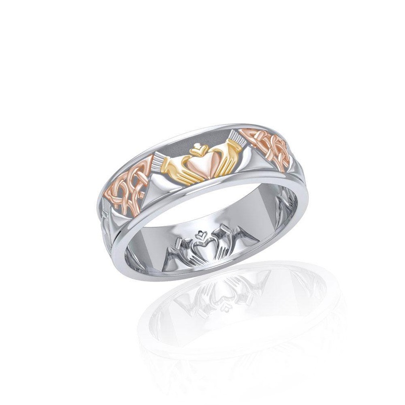 Celtic Knotwork Three Tone Claddagh Ring OTR3355The Claddagh design is a traditional token of loyalty and friendship as well as romantic love. The hands in the design represent friendship; the heart, love; the crown, loyalty. Linked with the eternal power