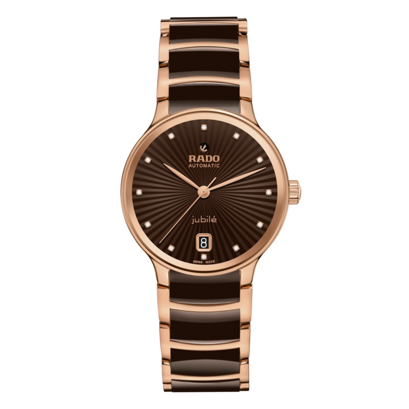 The Classic Centrix Automatic Diamonds watch has been reworked not only technically, but also aesthetically. The modified model has a rounded sapphire crystal that extends all the way to the edge and a curved case blending with the curved crystal edge. The overall appearance of this iconic timepiece is completed with adjusted case lugs and a bracelet made of polished rose-gold-coloured PVD-coated stainless steel with brown high-tech ceramic middle links. The brown facetted dial has an opulent 3D effect created by stamping a shaped dial and then filling it with lacquer. Inside, the three-hand calibre R763 movement exceeds standard accuracy test requirements from 3 to 5 positions, thanks to its antimagnetic Nivachron hairspring for increased reliability and accuracy. The watch is water resistant down to 50 m and offers 80 hours of power reserve.