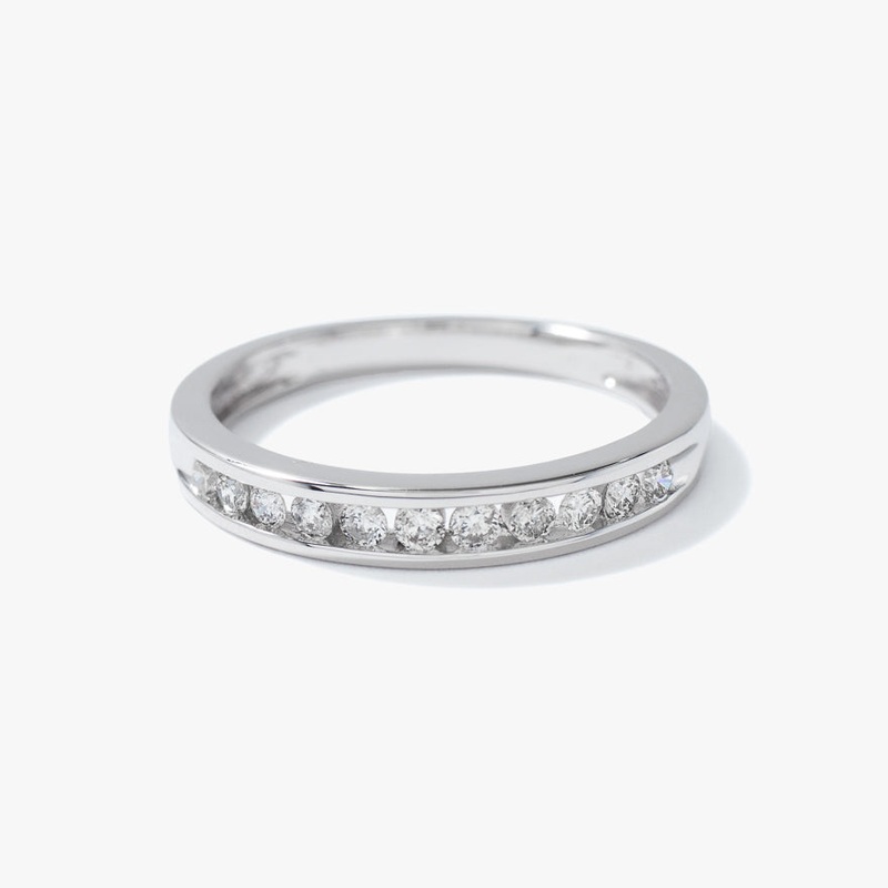 This elegant channel set diamond band is crafted in 14K white gold. It is set with 11 round brilliant cut diamonds for a total diamond weight of 0.25 carats. This would make for an ideal wedding band or anniversary ring.