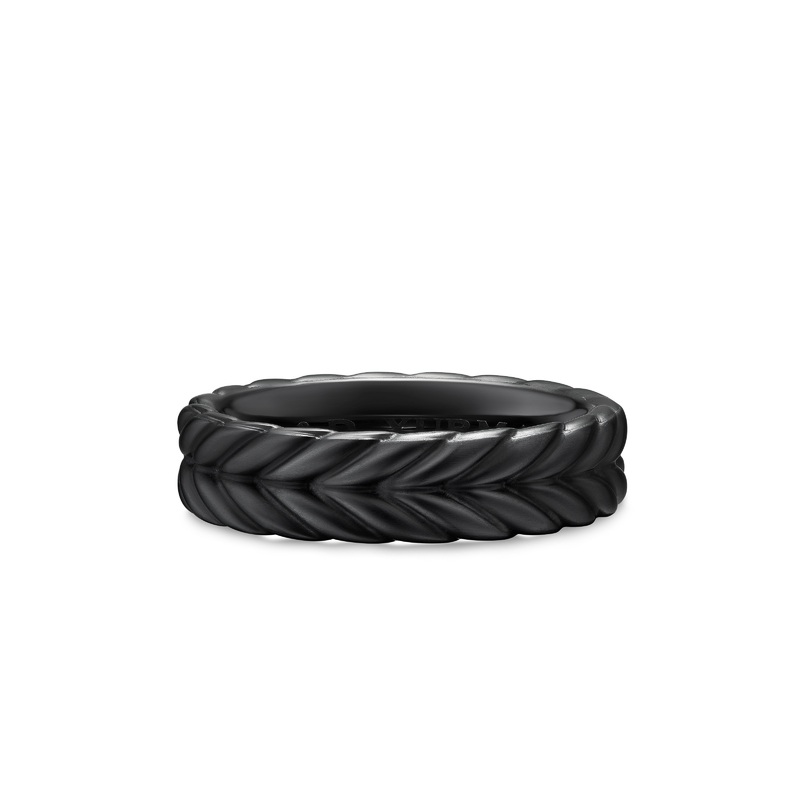David Yurman skillfully reinterprets chevron the ancient V-shaped pattern used in architecture and art in this modern, sculptural collection. Viewed in relation to one another, each half of the motif is a mirror image of Cable.Black titaniumRing, 6.2mmR352