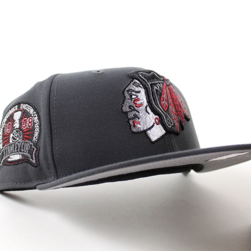Chicago Blackhawks 1998 Stanley Cup New Era 59Fifty Fitted Hat in Dark Graphite and Gray Under brim.Inspired by Nike with our own twisted to it.