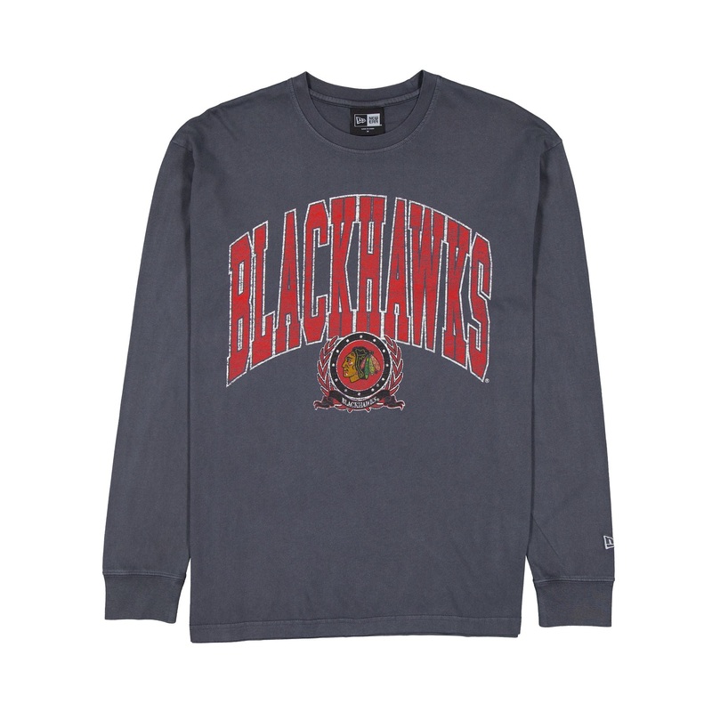 The Chicago Blackhawks Oversized Essentials Long Sleeve T-Shirt features a distressed screen-printed Blackhawks wordmark above a team logo at the front.