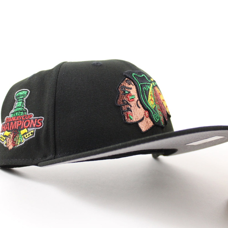 Chicago Blackhawks Stanley Cup Champions New Era 59Fifty Fitted Hat in Black and Gray Under brim.Inspired by with our own twisted to it.