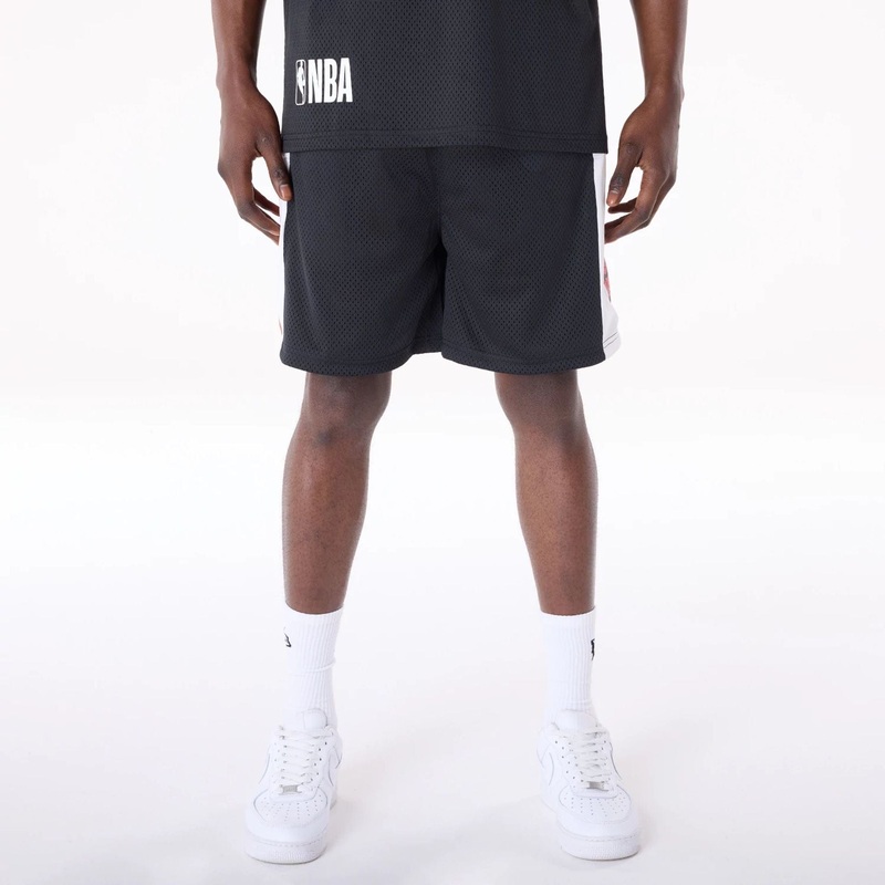 NBA Graphic Chicago Bulls Mesh ShortsChicago Bulls logo on side of left legChicago wordmark graphic down side of right legNBA logo on rear upper rightNew Era Flag embroidered on left sidePockets front left and rightDrawstring closureModel is 6ft tall and w