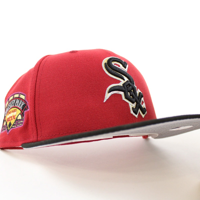 Chicago White Sox COMISKEY Park Era Fitted 59Fifty Cap in Dark Pinot Red, Black and Gray Under Brim.