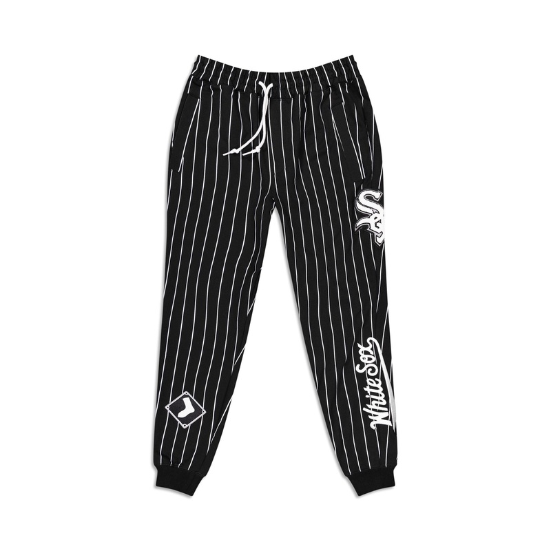 The Chicago White Sox Logo Select Pinstripe Jogger features a chenille applique White Sox logo and embroidered wordmark at the left leg with an alternate team logo at the right ankle.